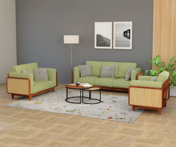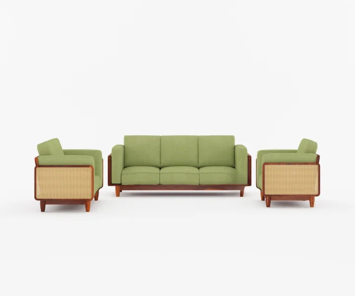 Arica 3+2+1 Wooden Sofa Set in Honey Finish is designed to bring a refreshing blend of natural warmth and contemporary comfort to spacious Indian living rooms. Crafted from solid Sheesham wood, the sturdy frame offers excellent durability and long-lasting support, while the honey finish beautifully enhances the wood’s natural grain with a bright, welcoming appeal. Upholstered in rich green fabric, this sofa set adds a vibrant yet soothing contrast that elevates the overall décor. With a relaxed 16-inch seating height, the generously sized three seater at 80 L x 34 W x 32 H inches is complemented by a comfortable two seater and a well-proportioned single seater, making it ideal for family gatherings and entertaining guests. Delivered pre-assembled and backed by a 36-month warranty, this 3+2+1 sofa set combines comfort, style, and dependable craftsmanship effortlessly.