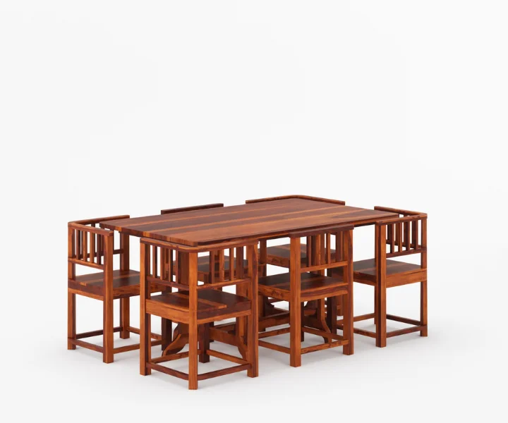 The stunning Ananta 6-seater dining table is made in a beautiful finish, crafted perfectly by vinayakartplace This magnificent piece of furniture is designed to elevate the decor of your dining room with its classic and sophisticated design. Crafted from premium-quality Sheesham wood, this Dining Set is built to last and withstand time. The table’s sturdy legs ensure optimal stability, while the smooth surface makes it easy to clean and maintain. With its impeccable design and unparalleled comfort, the Maron 6-seater dining table set is a must-have for any modern home. Experience the ultimate dining experience with this exquisite furniture piece from Maron .