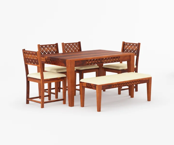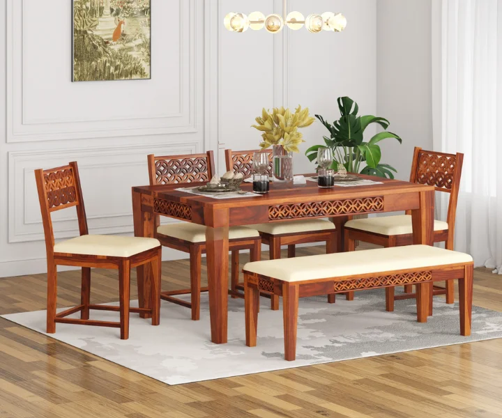 The stunning Ananta 6-seater dining table is made in a beautiful finish, crafted perfectly by vinayakartplace This magnificent piece of furniture is designed to elevate the decor of your dining room with its classic and sophisticated design. Crafted from premium-quality Sheesham wood, this Dining Set is built to last and withstand time. The table’s sturdy legs ensure optimal stability, while the smooth surface makes it easy to clean and maintain. With its impeccable design and unparalleled comfort, the Maron 6-seater dining table set is a must-have for any modern home. Experience the ultimate dining experience with this exquisite furniture piece from Maron .