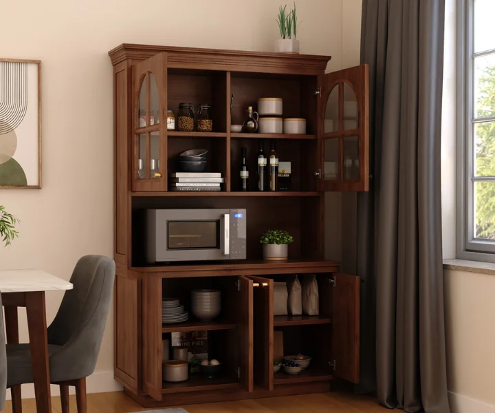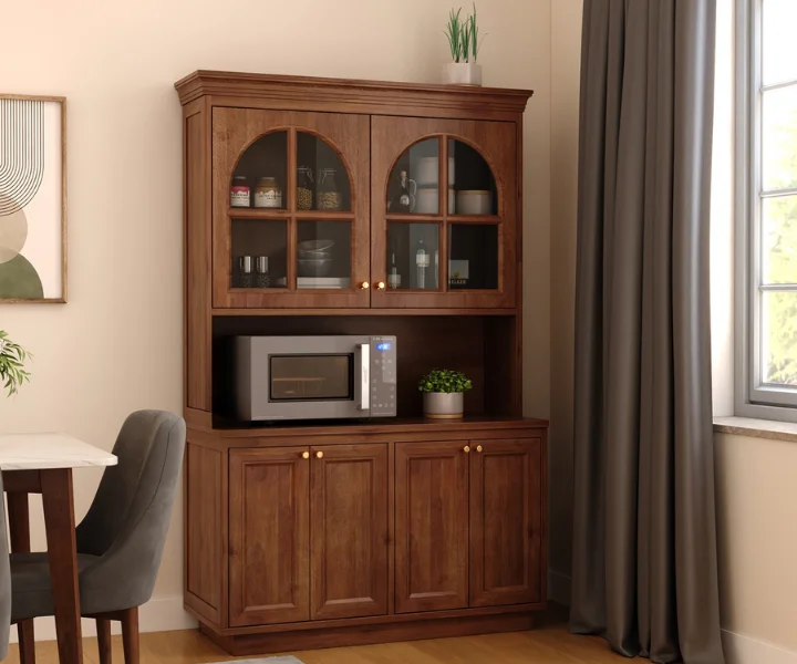 Curved Arch Glass Cabinet: Top section features beautifully arched glass doors to showcase crockery or decor while keeping them dust-free.