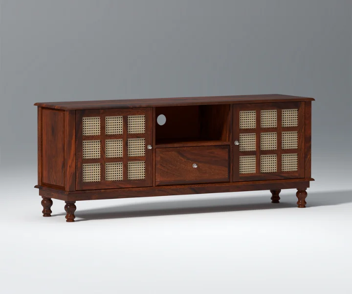 Nonna TV unit is designed in such a way that it encompasses five drawers of equal dimension and one open shelf to place the set-top box in the midsection.
