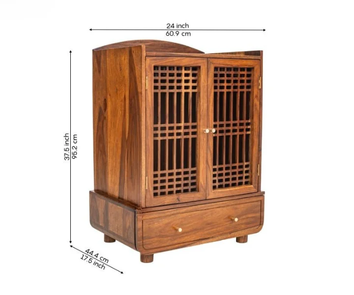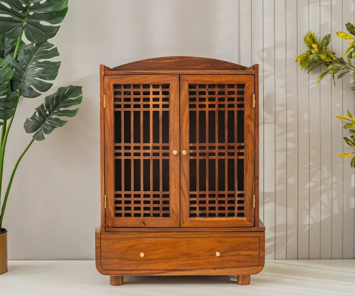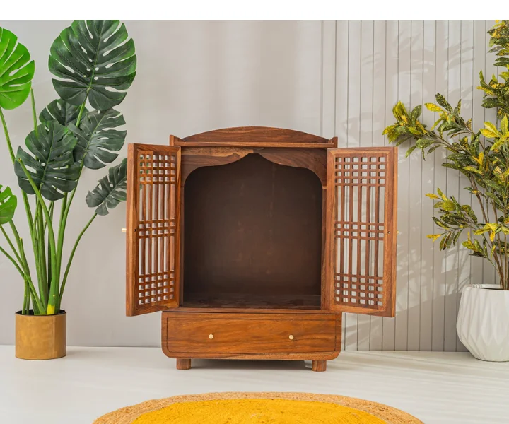 - Yaj Sheesham Wood Home Temple With Panelled Slatted Doors & Large Drawer Storage with Cane Doors & Drawer Storage. The top of the unit is made in a triple layer with a small dome-like pattern at various spots. It has two doors in front, which are further indented with curio design. A pull-out tray and a drawer follow the temple. Legs are carved with curly brackets at the inverted sides.